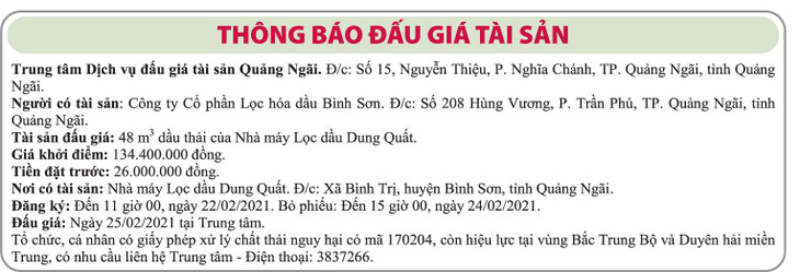 Ngày 25/2/2021, đấu giá 48m3 dầu thải tại tỉnh Quảng Ngãi