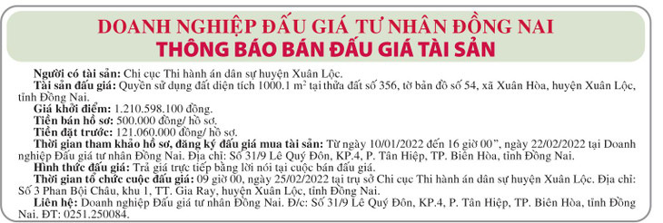 (BĐT) - Doanh nghiệp Đấu giá tư nhân Đồng Nai thông báo đấu giá tài sản vào ngày 25/2/2022 do Chi cục Thi hành án dân sự huyện Xuân Lộc ủy quyền như sau:
