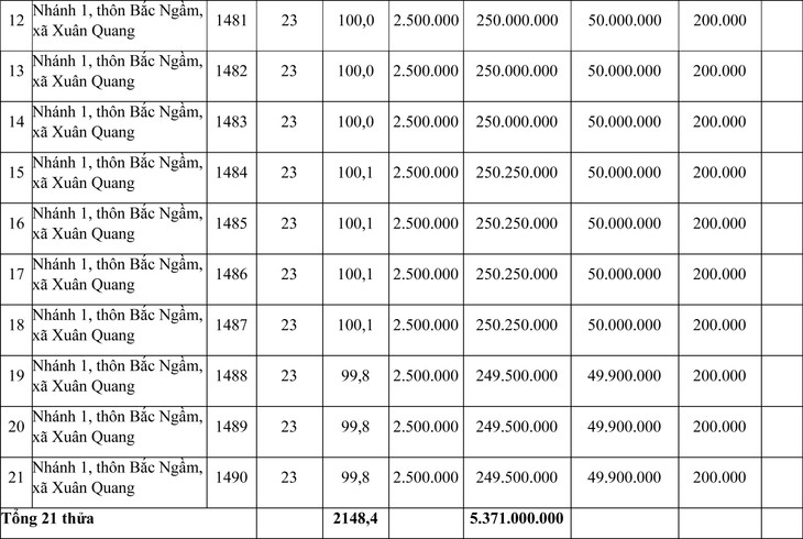 BIỂU TỔNG HỢP 21 LÔ ĐẤT ĐẤU GIÁ TRÊN ĐỊA BÀN XÃ XUÂN QUANG, HUYỆN BẢO THẮNG