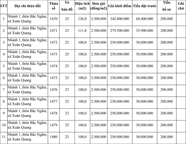 - Đơn giá khởi điểm: 2.500.000 đồng/ m2