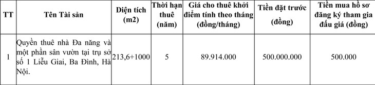 - Tài sản đấu giá: Quyền thuê nhà Đa năng và một phần sân vườn tại trụ sở số 1 Liễu Giai, Ba Đình, Hà Nội.