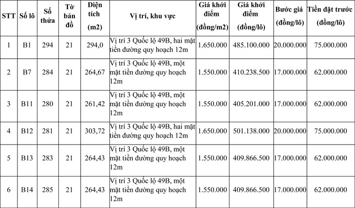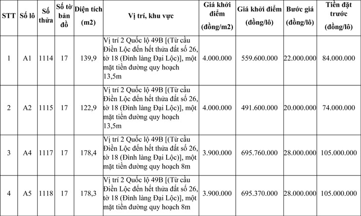 1. Số lô đất, nơi có tài sản đấu giá, danh mục loại đất, vị trí, diện tích và hạ tầng kỹ thuật, tài sản gắn liền với các thửa đất: 54 lô đất tại các xã Điền Hải, Điền Hòa, Điền Lộc và Điền Môn, huyện Phong Điền, tỉnh Thừa Thiên Huế, cụ thể như sau: