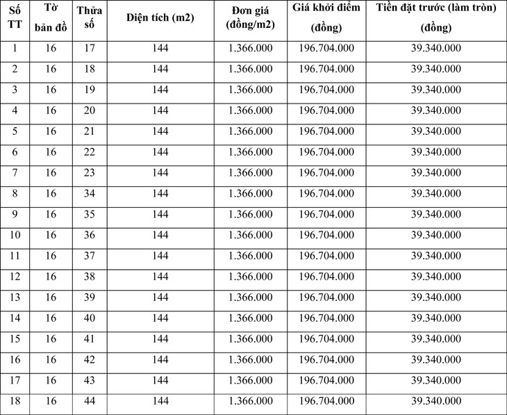 - Tiền đặt trước: 20% GKĐ (Nộp trong thời hạn 03 ngày làm việc trước ngày mở cuộc đấu giá).