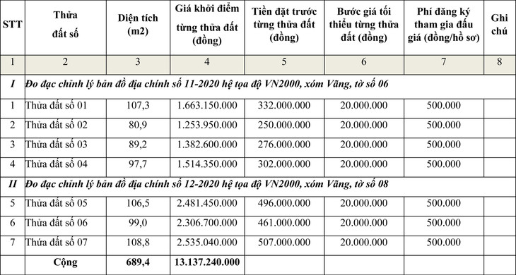 5. Tổng giá khởi điểm của tài sản đấu giá: 13.137.240.000 đồng (Mười ba tỷ một trăm ba mươi bảy triệu hai trăm bốn mươi nghìn đồng). Giá trên chưa bao gồm: Phí trước bạ và các lệ phí khác.