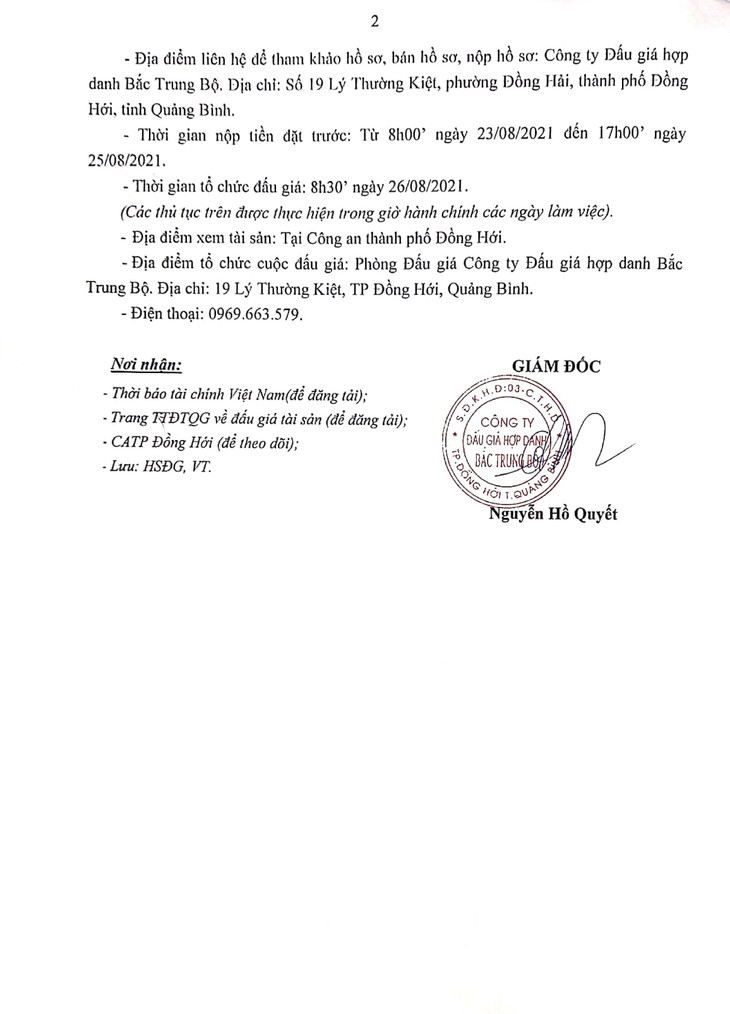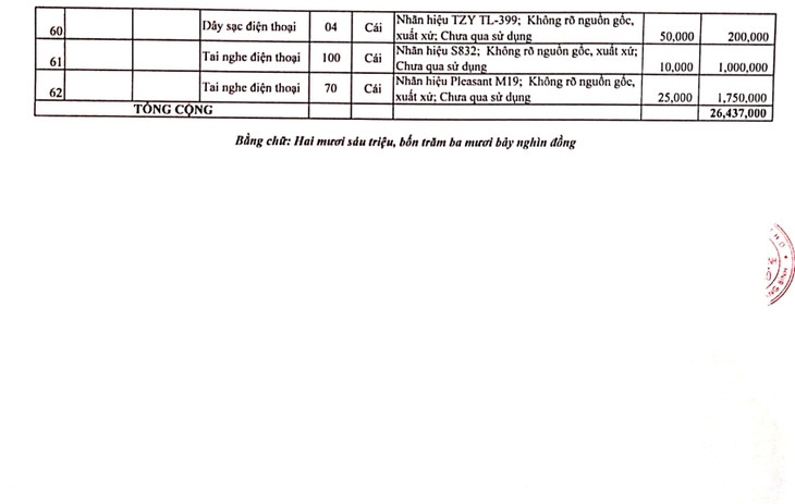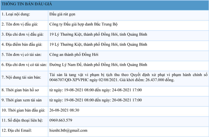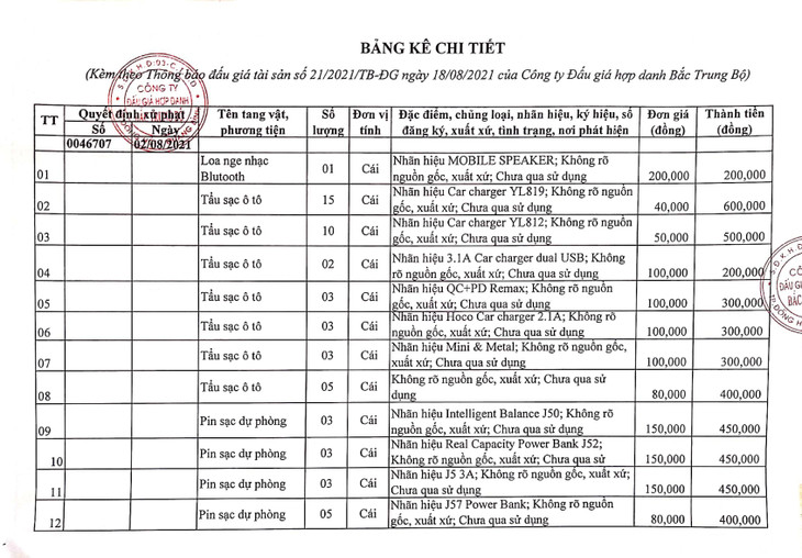 Tài sản là tang vật vi phạm bị tịch thu theo Quyết định xử phạt vi phạm hành chính số 0046707/QĐ-XPVPHC ngày 02/08/2021. Giá khởi điểm: 26.437.000 đồng.
