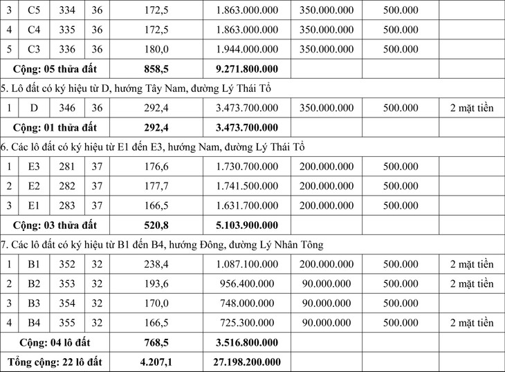3. Tài sản đấu giá: Quyền sử dụng 22 thửa đất ở các điểm đất lẻ thuộc phường Bắc Nghĩa, thành phố Đồng Hới, tỉnh Quảng Bình; Diện tích từ 153,0m2/thửa đến 292,4m2/thửa; Giá khởi điểm từ 489.600.000đồng/thửa đến 3.473.700.000 đồng/thửa.
