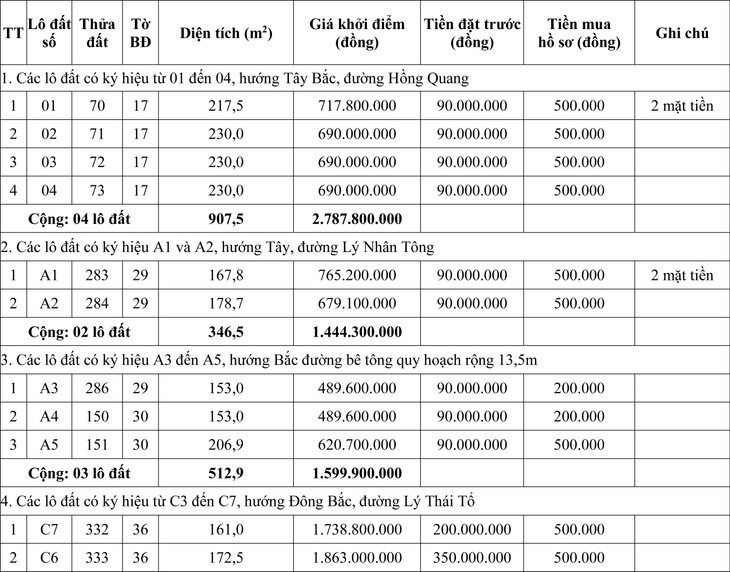 4. Tiền đặt trước: Nộp từ 90.000.000đồng/thửa đất đăng ký đến 350.000.000đồng/thửa đất đăng ký (tùy vào thửa đất đăng ký).