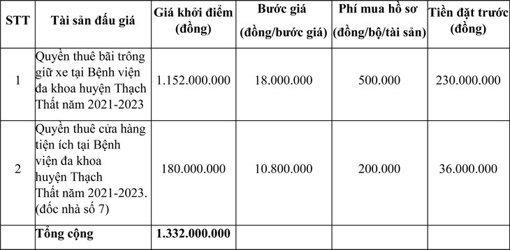Địa điểm tổ chức đấu giá: Hội trường 2- tầng 2 nhà A8 bệnh viện đa khoa huyện Thạch Thất, thôn 84 xã Kim Quan huyện Thạch Thất Hà Nội.