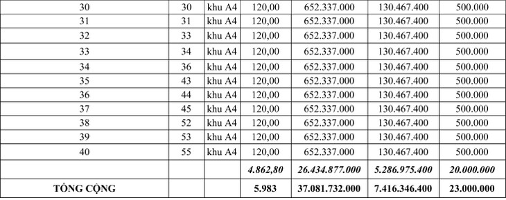 Tổng giá khởi điểm: 1.536.510.000 đồng (Một tỷ năm trăm ba mươi sáu triệu năm trăm mười ngàn đồng)