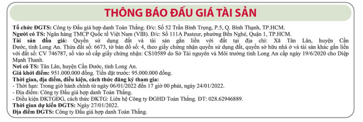 (BĐT) - Công ty Đấu giá hợp danh Toàn Thắng thông báo đấu giá tài sản vào ngày 27/1/2022 do Ngân hàng TMCP Quốc tế Việt Nam (VIB) ủy quyền như sau: