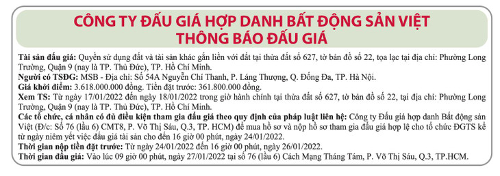 Ngày 09/01/2026, đấu giá toàn bộ diện tích thương mại số S14 tại tầng 1, thuộc tòa nhà Technopark Tower, xã Gia Lâm, TP. Hà Nội