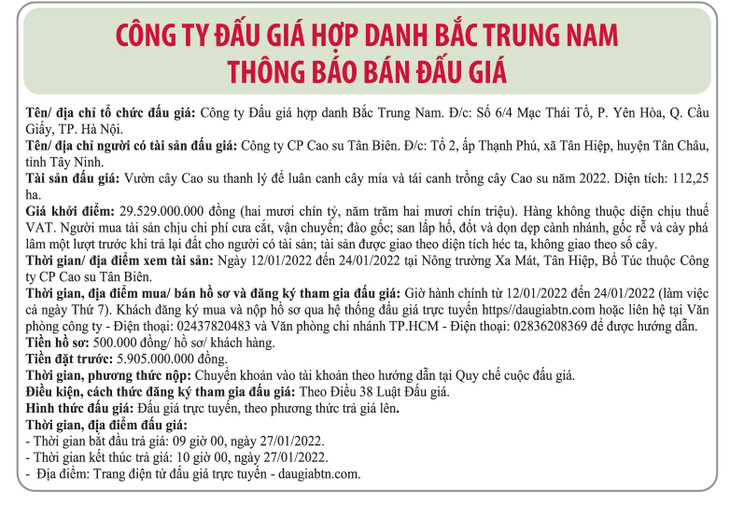(BĐT) - Công ty Đấu giá hợp danh Bắc Trung Nam thông báo đấu giá tài sản vào ngày 27/1/2022 do Công ty Cao su Tân Biên ủy quyền như sau: