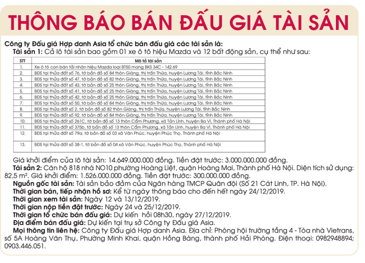 Ngày 19/12/2025, đấu giá quyền sử dụng đất và tài sản gắn liền với đất tại phường Võ Cường, tỉnh Bắc Ninh