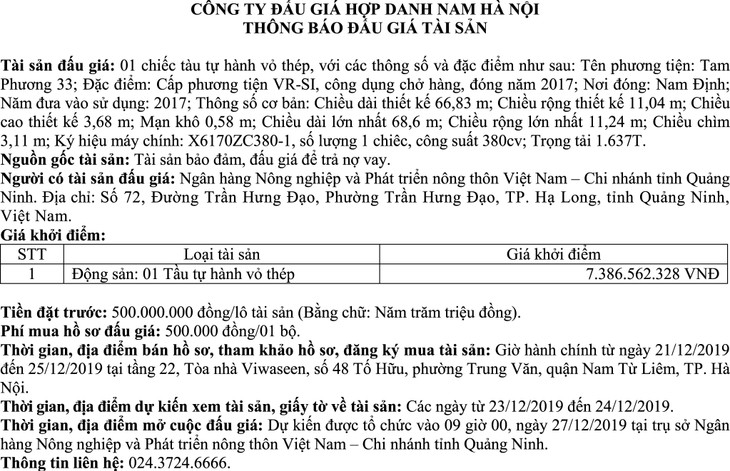 (BĐT) - Công ty Đấu giá Hợp danh Nam Hà Nội thông báo bán đấu giá tài sản vào ngày 27/12/2019 do Ngân hàng Nông nghiệp và Phát triển nông thôn Việt Nam – Chi nhánh tỉnh Quảng Ninh ủy quyền như sau: