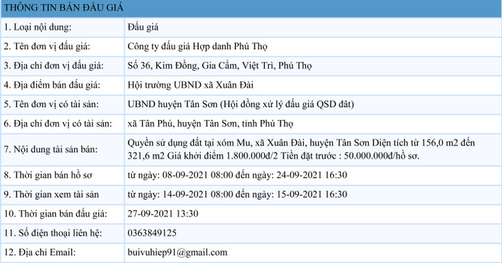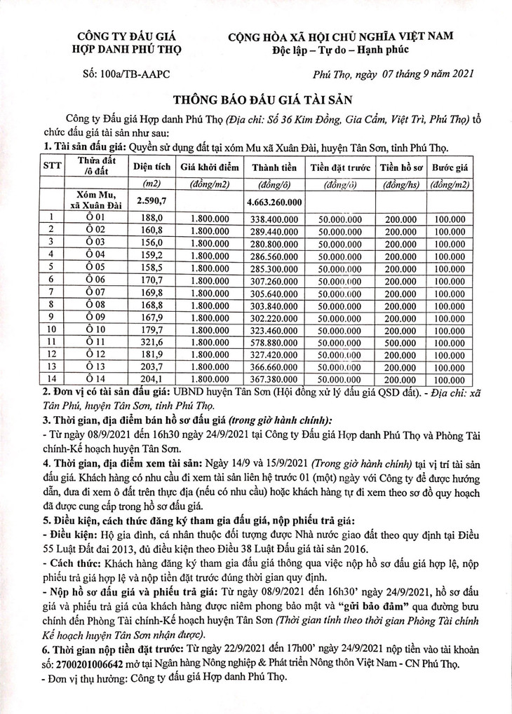 Quyền sử dụng đất tại xóm Mu, xã Xuân Đài, huyện Tân Sơn. Diện tích từ 156,0 m2 đến 321,6 m2 Giá khởi điểm 1.800.000đ/2 Tiền đặt trước: 50.000.000đ/hồ sơ.