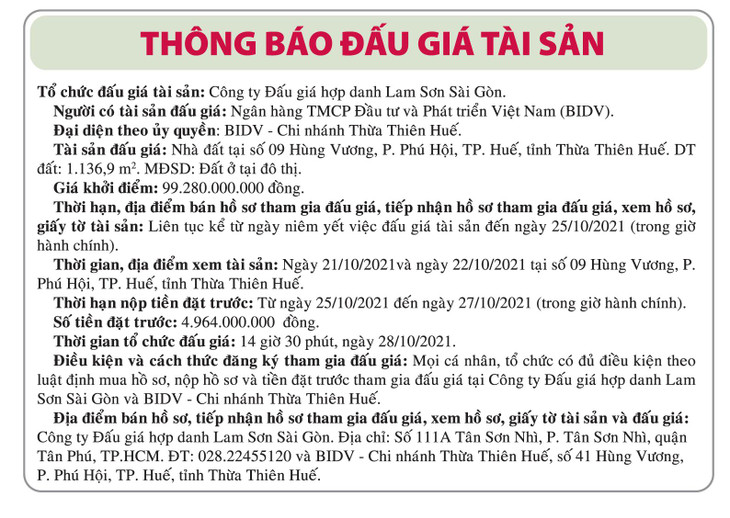 (BĐT) - Công ty Đấu giá hợp danh Lam Sơn Sài Gòn và BIDV Chi nhánh Thừa Thiên Huế thông báo đấu giá tài sản vào ngày 281/10/2021 do BIDV ủy quyền như sau:
