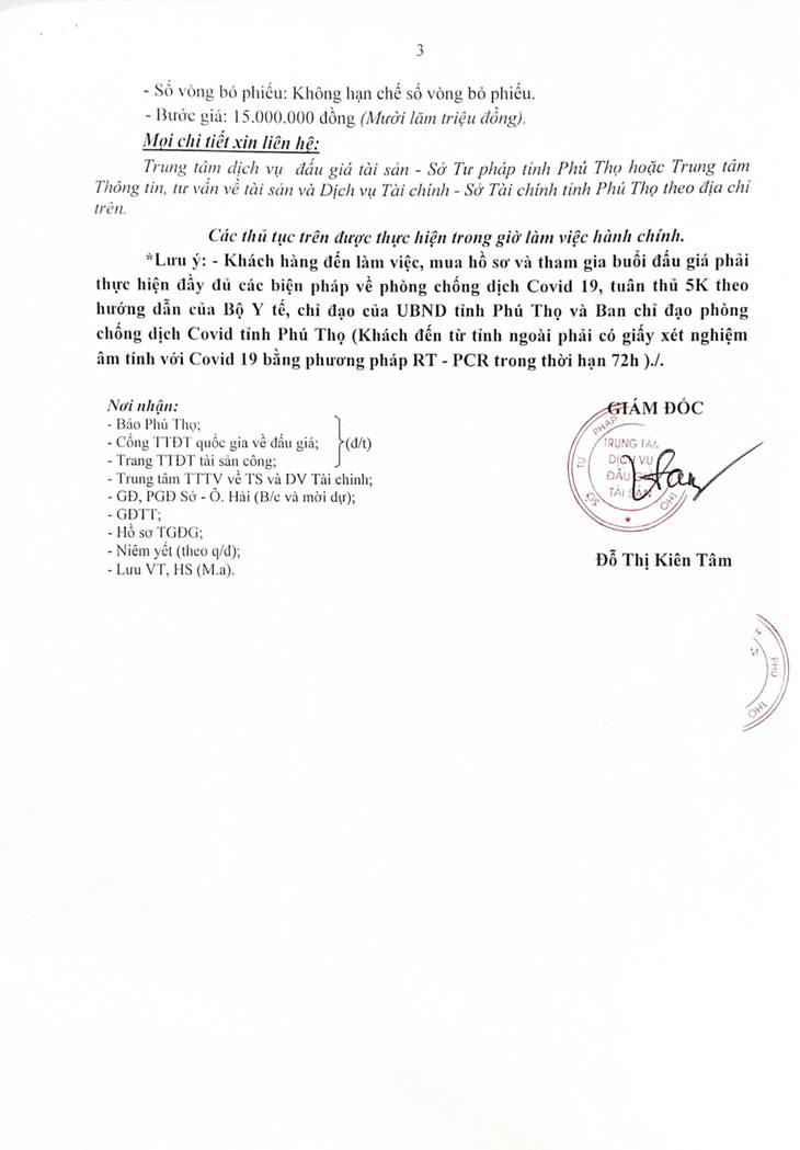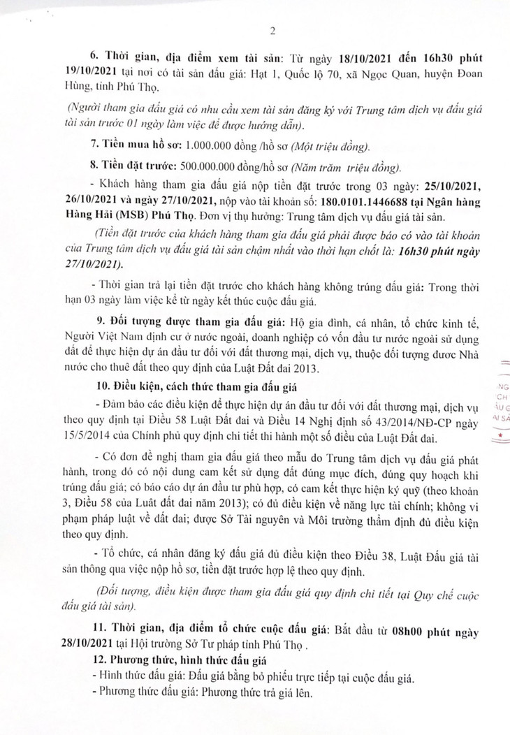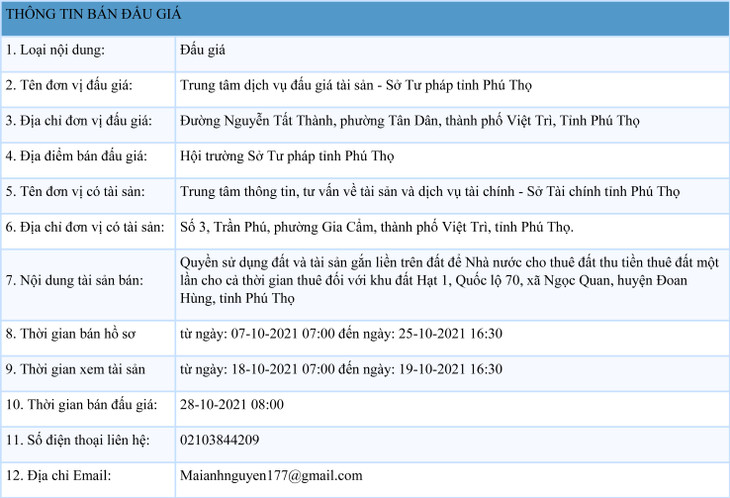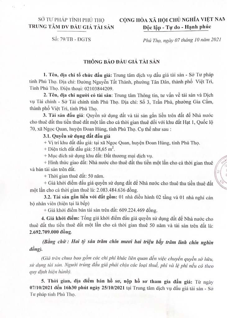 (BĐT) - Trung tâm dịch vụ đấu giá tài sản - Sở Tư pháp tỉnh Phú Thọ thông báo đấu giá tài sản vào ngày 28/10/2021 do Trung tâm thông tin, tư vấn về tài sản và dịch vụ tài chính - Sở Tài chính tỉnh Phú Thọ ủy quyền như sau: