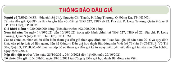 (BĐT) - Công ty Đấu giá hợp danh Bất động sản Việt thông báo đấu giá tài sản vào ngày 28/10/2021 do MB ủy quyền như sau: