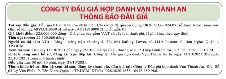 (BĐT) - Công ty Đấu giá hợp danh Vạn Thành An thông báo đấu giá tài sản vào ngày 28/10/2021 do VIB ủy quyền như sau: