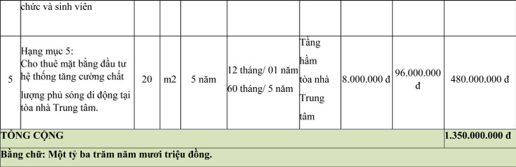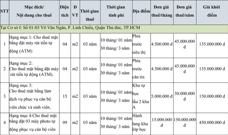 3. Tài sản đấu giá, giá khởi điểm: Giá trị mặt bằng cho thuê làm dịch vụ của Trường Đại học Sư phạm Kỹ thuật TP.Hồ Chí Minh. Các hạng mục cho thuê cụ thể như sau: