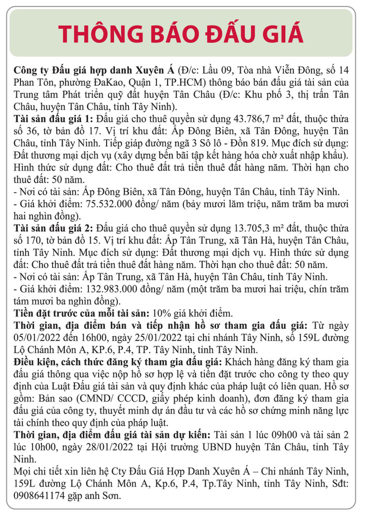 (BĐT) - Công ty Đấu giá hợp danh Xuyên Á thông báo đấu giá tài sản vào ngày 28/1/2022 do Trung tâm Phát triển quỹ đất huyện Tân Châu ủy quyền như sau: