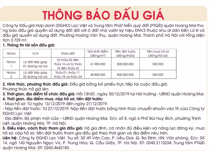 (BĐT) - Công ty Đấu giá Hợp danh (ĐGHD) Lạc Việt và Trung tâm Phát triển quỹ đất (PTQĐ) quận Hoàng Mai thông báo đấu giá vào ngày 28/12/2019 là quyền sử dụng đất đối với ô đất nhà vườn ký hiệu ĐNV3 thuộc khu di dân Đền Lừ III và đấu giá quyền sử dụng đất, Phường Hoàng Văn Thụ, quận Hoàng Mai, Thành phố Hà Nội với tổng diện tích 3.729 m2 như sau: