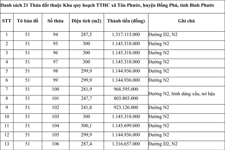 - Quyền sử dụng đất 21 thửa thuộc Trung tâm hành chính xã Tân Phước, huyện Đồng Phú, tỉnh Bình Phước
