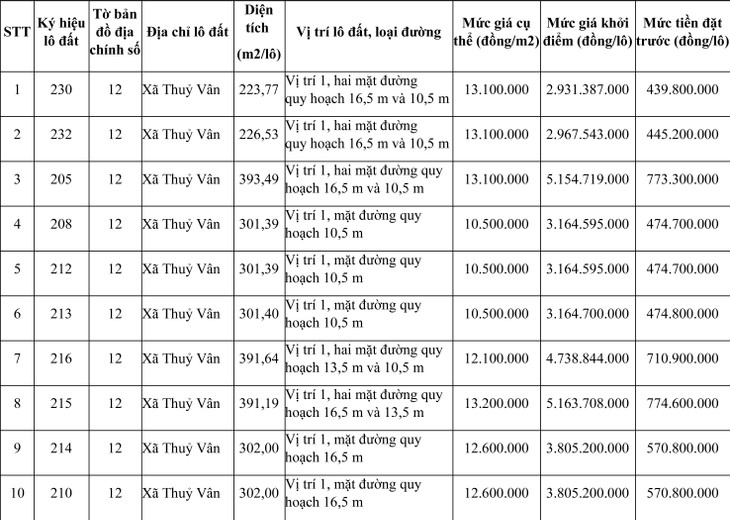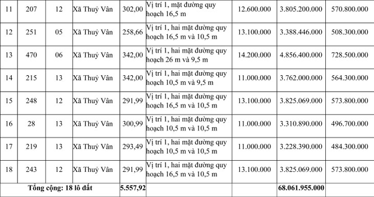 Tên quỹ đất: 18 lô đất tại Khu tái định cư Thuỷ Vân, xã Thủy Vân, thị xã Hương Thủy, tỉnh Thừa Thiên Huế;