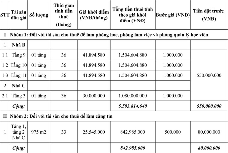 3. Tài sản đấu giá, giá khởi điểm, bước giá, tiền đặt trước: Quyền khai thác sử dụng tài sản công vào mục đích cho thuê thuộc quyền sở hữu hợp pháp của Học viện Tư pháp bao gồm hội trường, phòng học, phòng hội thảo, nhà ăn, mặt bằng trông giữ xe. Cụ thể như sau: