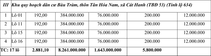 04 lô Khu QHDC Bàu Tràm, thôn Tân Hóa Nam, xã Cát Hanh (Tỉnh lộ 634) –TBĐ 53.