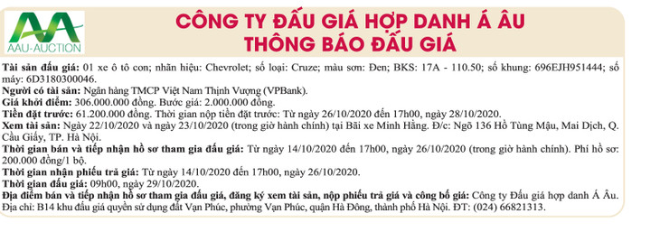 (BĐT) - Công ty Đấu giá hợp danh Á Âu thông báo đấu giá tài sản vào ngày 29/10/2020 do VPBank ủy quyền như sau: