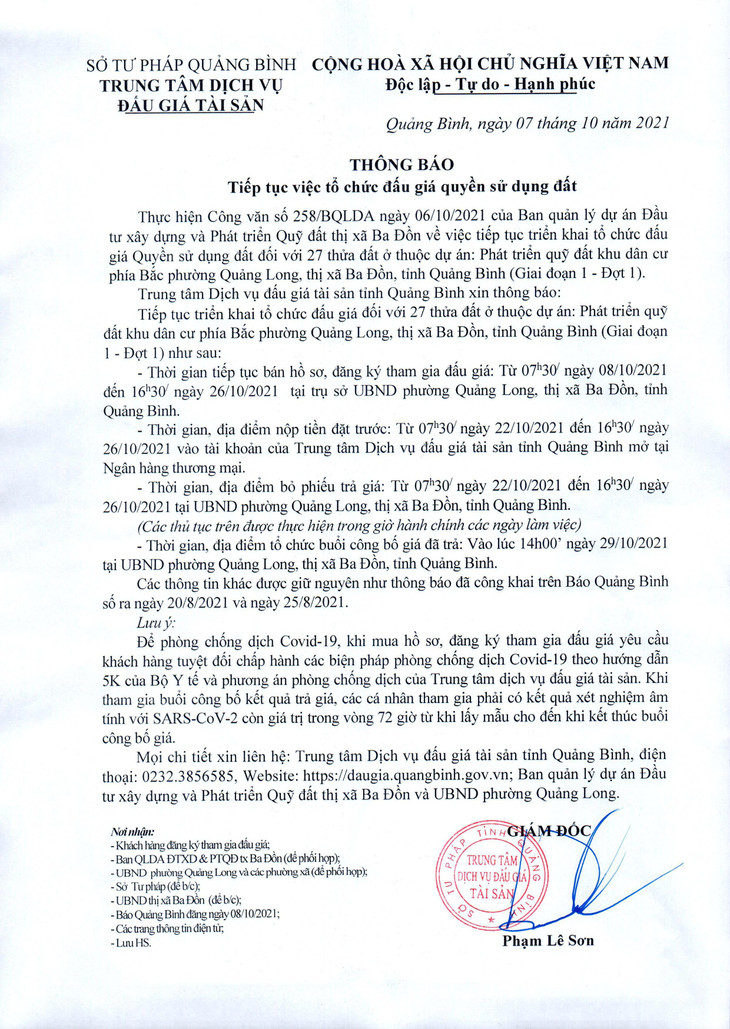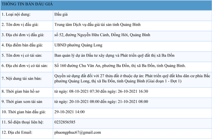 Quyền sử dụng đất đối với 27 thửa đất ở thuộc dự án: Phát triển quỹ đất khu dân cư phía Bắc phường Quảng Long, thị xã Ba Đồn, tỉnh Quảng Bình (Giai đoạn 1 - Đợt 1)