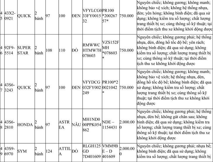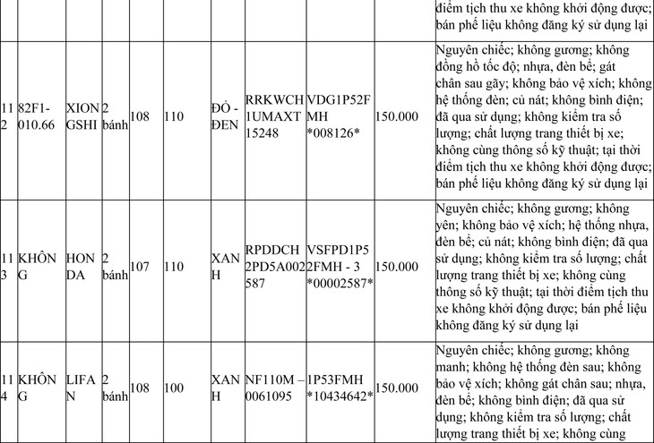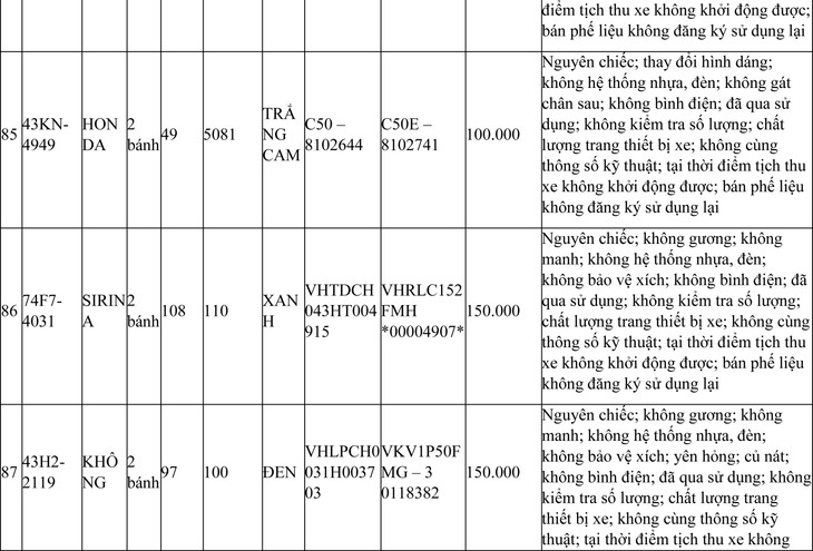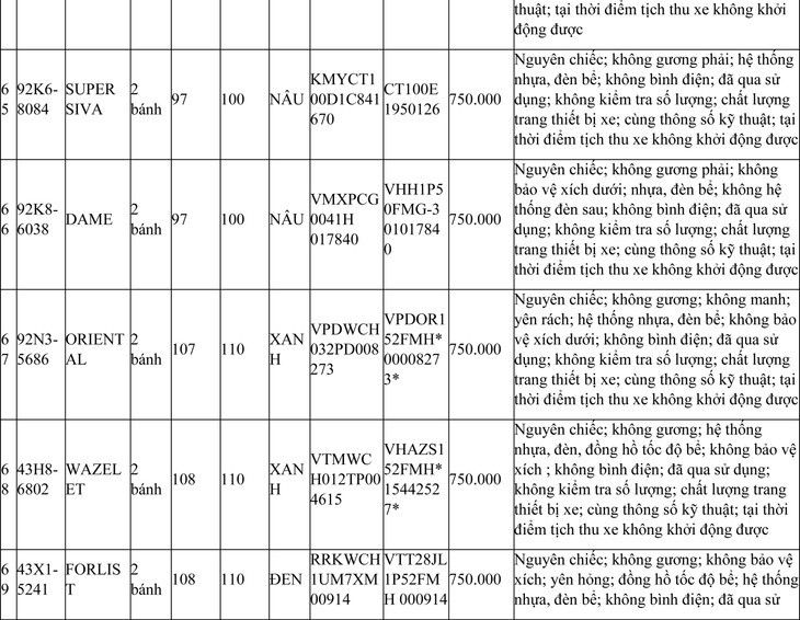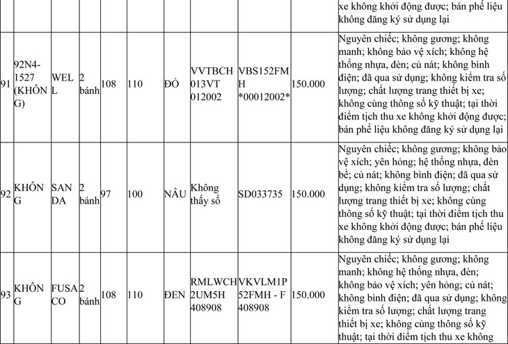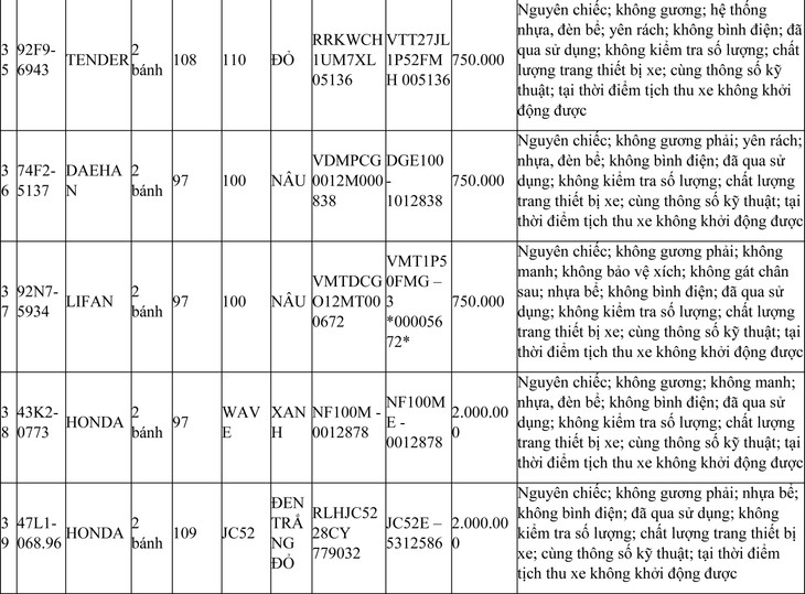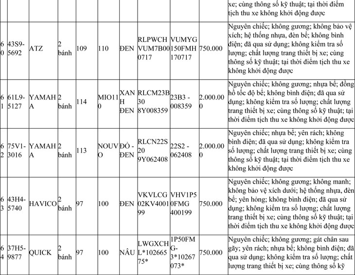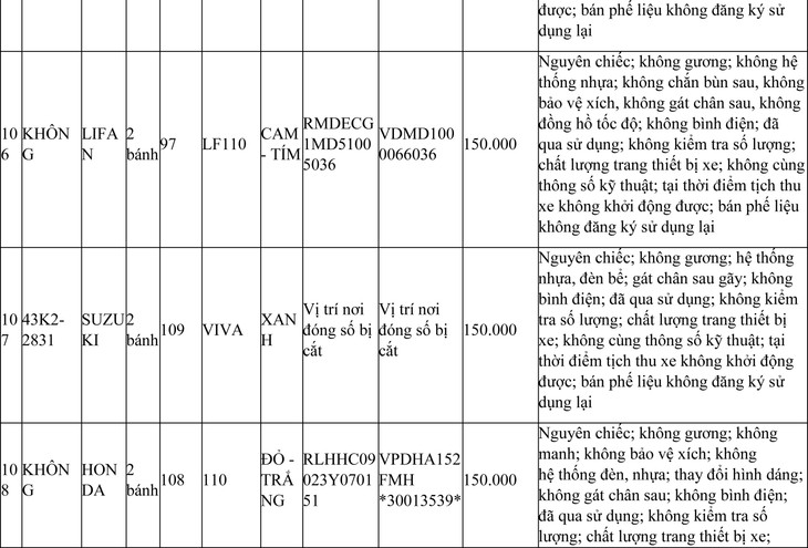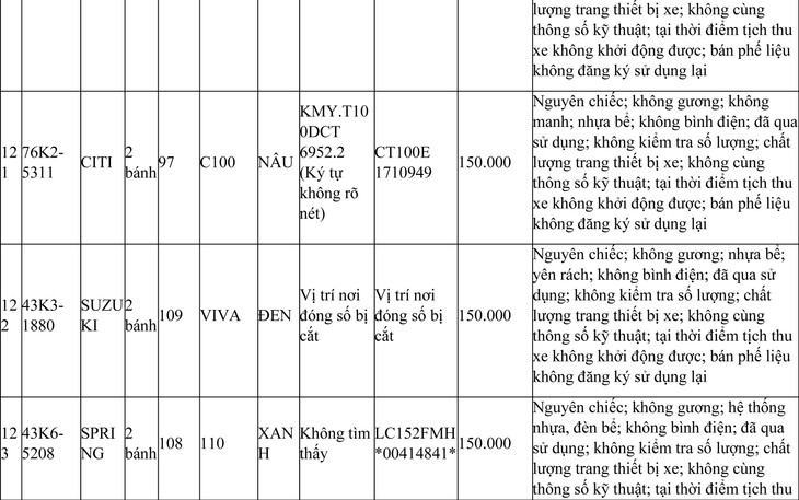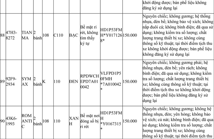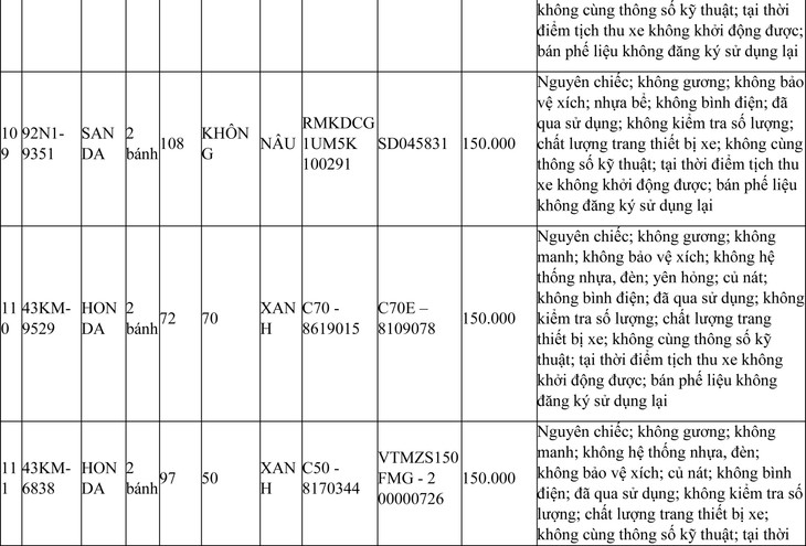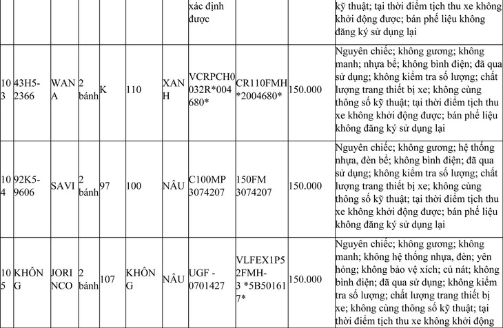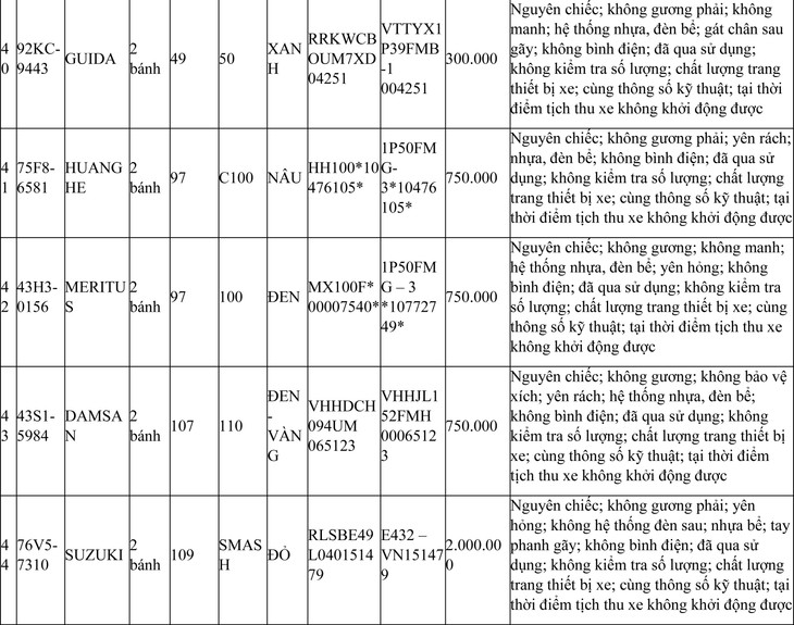 2. Đối với 44 xe mô tô xe máy đã qua sử dụng không được đăng ký biển số sử dụng lại (bán phế liệu):