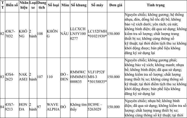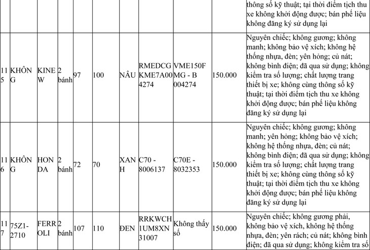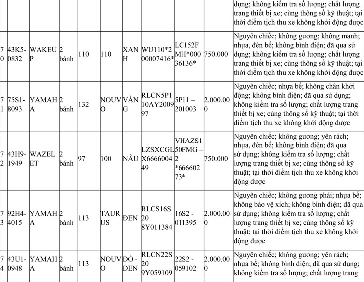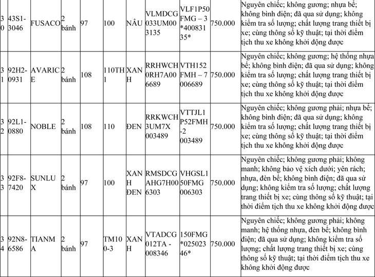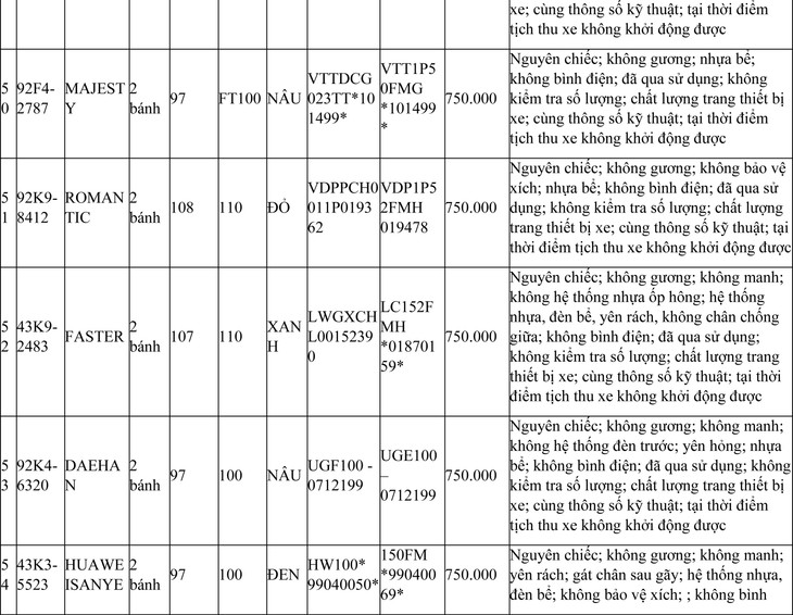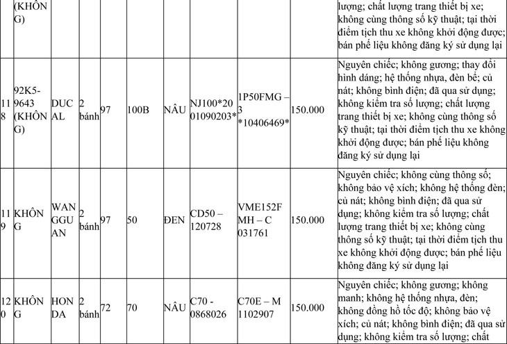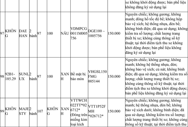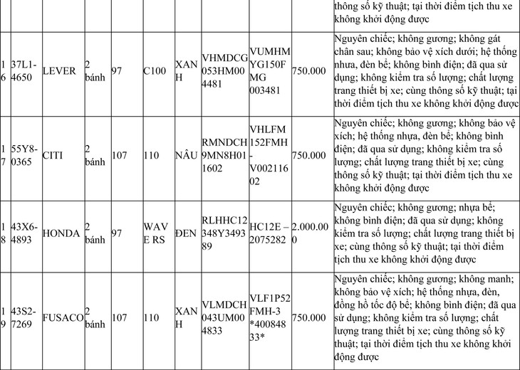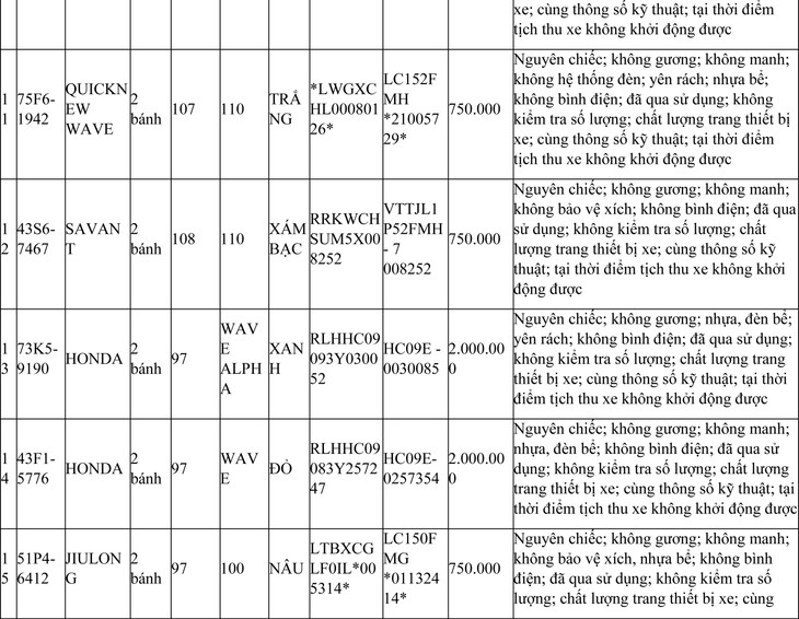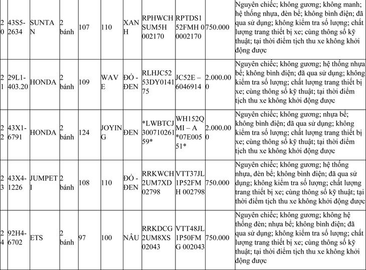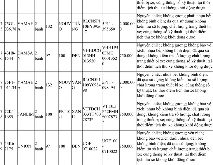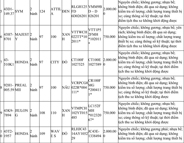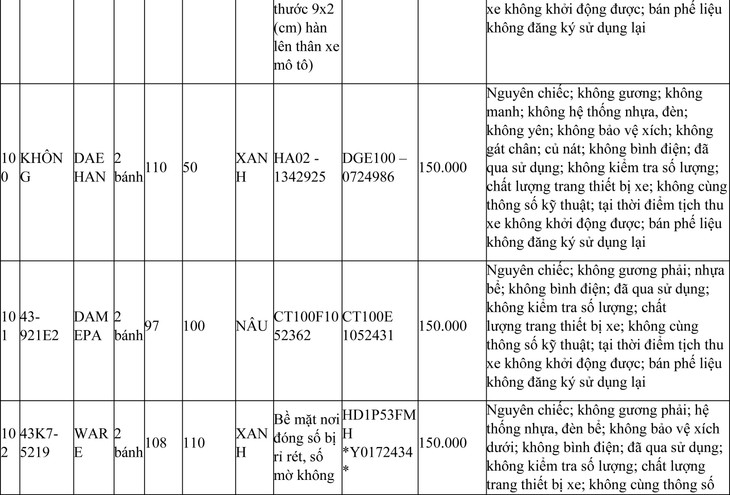 2. Đối với 44 xe mô tô xe máy đã qua sử dụng không được đăng ký biển số sử dụng lại (bán phế liệu):