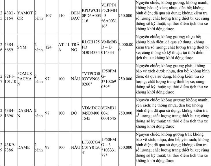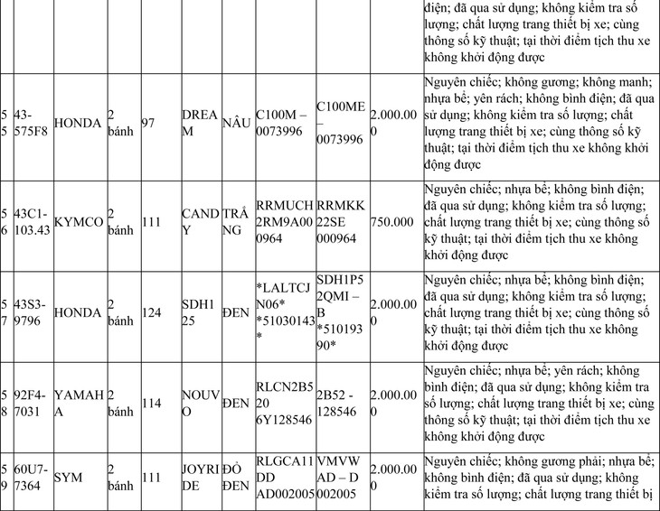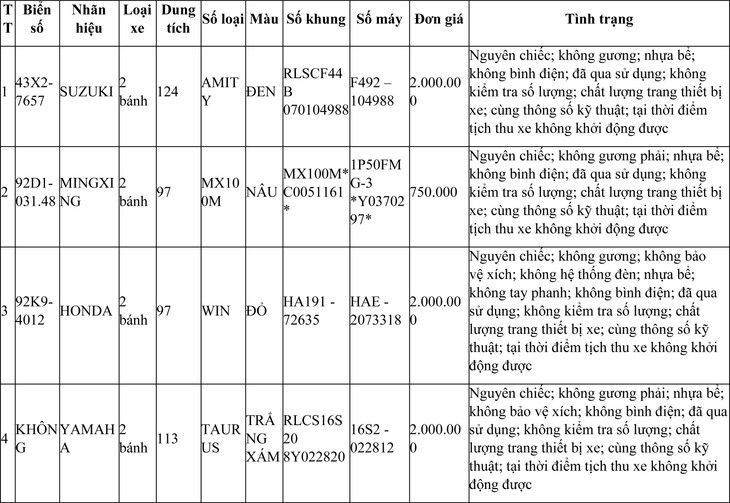 3. Tên tài sản đấu giá: 125 mô tô, xe máy đã qua sử dụng (trong đó có 81 xe được đăng ký biển số sử dụng lại; 44 xe không được đăng ký biển số sử dụng lại, bán phế liệu). Có danh mục chi tiết kèm theo.