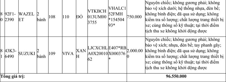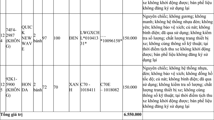 + Giá trị 44 xe không được đăng ký biển số sử dụng lại (bán phế liệu) là: 6.550.000 đồng (Bằng chữ: Sáu triệu, năm trăm năm mươi nghìn đồng).