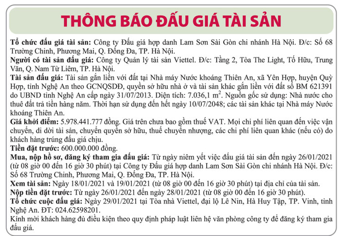 Ngày 29/1/2021, đấu giá quyền sử dụng đất và tài sản gắn liền với đất tại nhà máy nước khoáng Thiên An, tỉnh Nghệ An