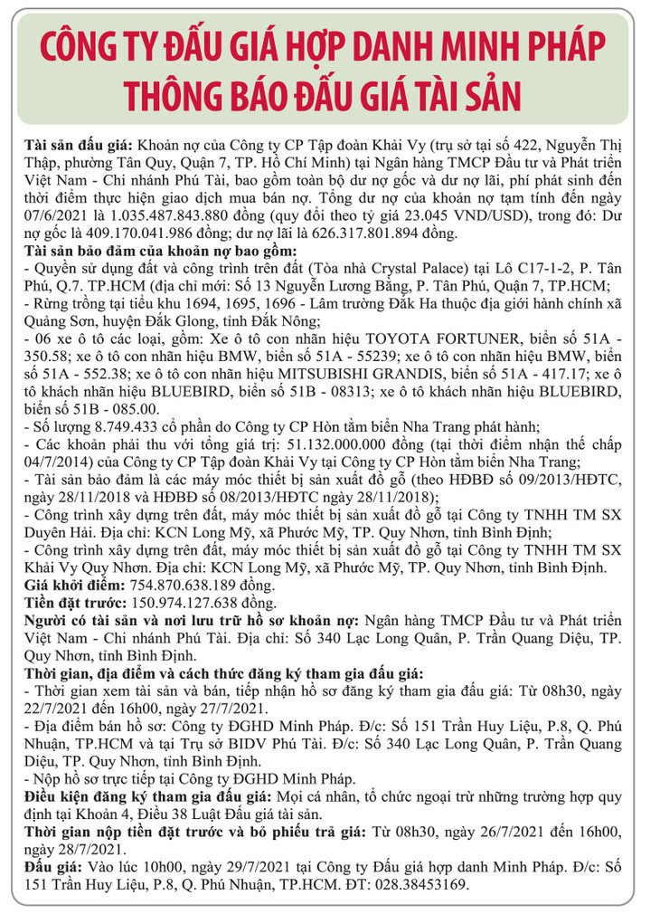 (BĐT) - Công ty Đấu giá hợp danh Minh Pháp thông báo đấu giá khoản nợ của Công ty Tập đoàn Khải Vy tại Ngân hàng TMCP Đầu tư và Phát triển Việt Nam (BIDV) – Chi nhánh Phú Tài vào ngày 29/7/2021 như sau: