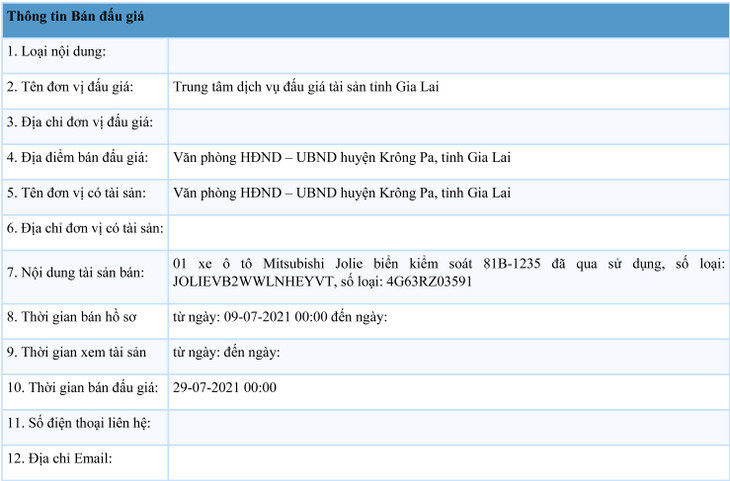 3. Tài sản đấu giá: 01 xe ô tô Mitsubishi Jolie biển kiểm soát 81B-1235 đã qua sử dụng, số loại: JOLIEVB2WWLNHEYVT, số loại: 4G63RZ03591; số khung: RLA00VB2W41003111, năm sản xuất: 2004, nước sản xuất: Việt Nam.