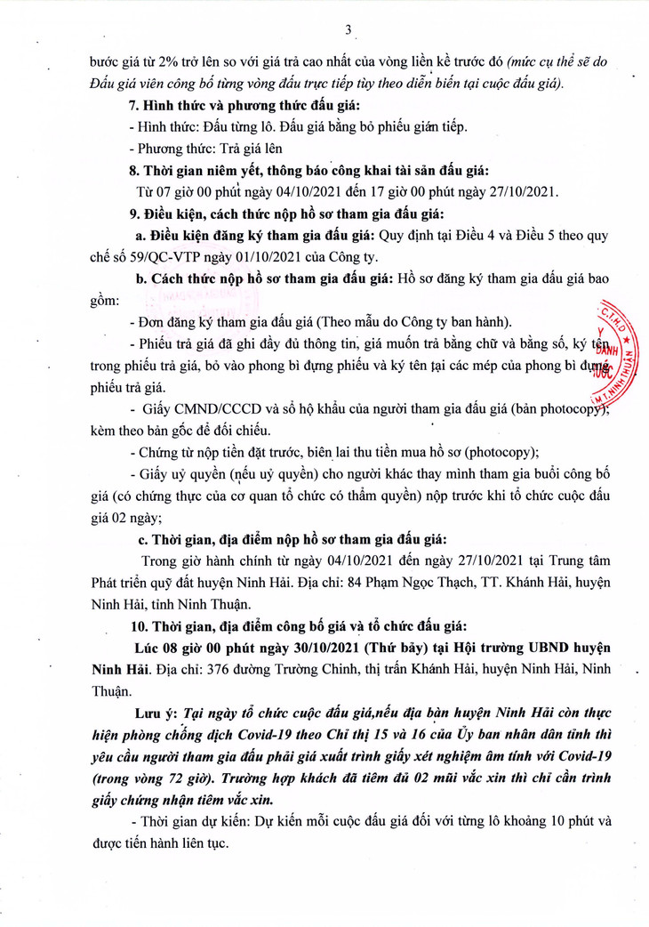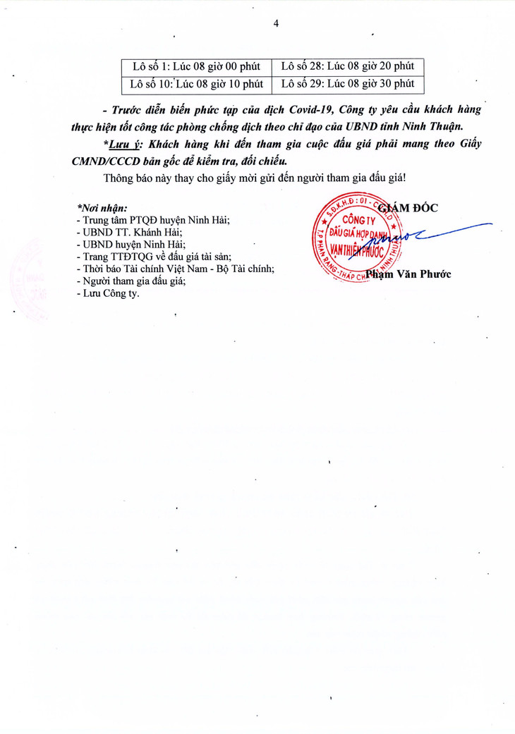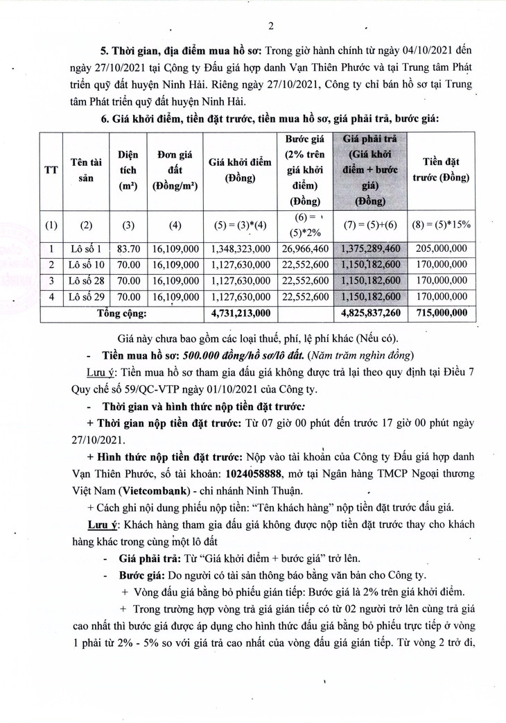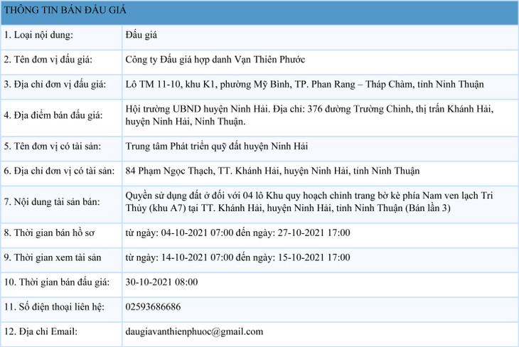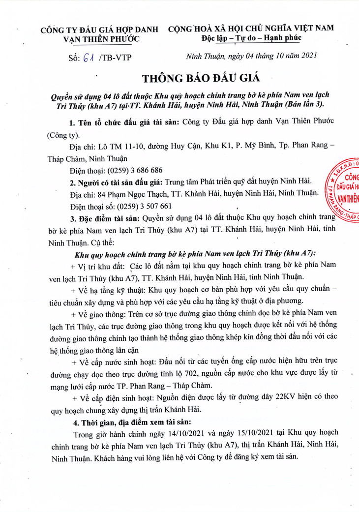 Quyền sử dụng đất ở đối với 04 lô Khu quy hoạch chỉnh trang bờ kè phía Nam ven lạch Tri Thủy (khu A7) tại TT. Khánh Hải, huyện Ninh Hải, tỉnh Ninh Thuận (Bán lần 3)