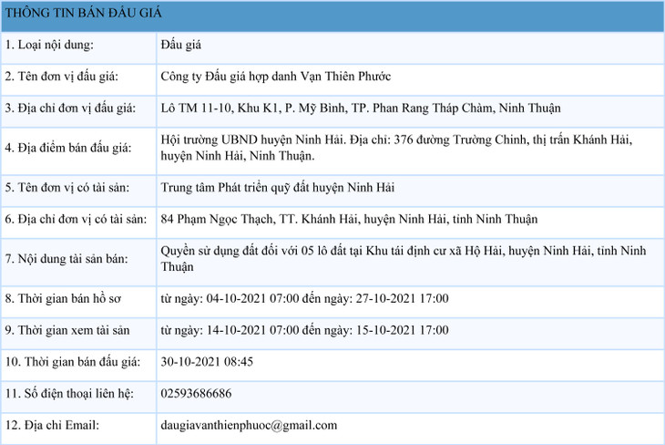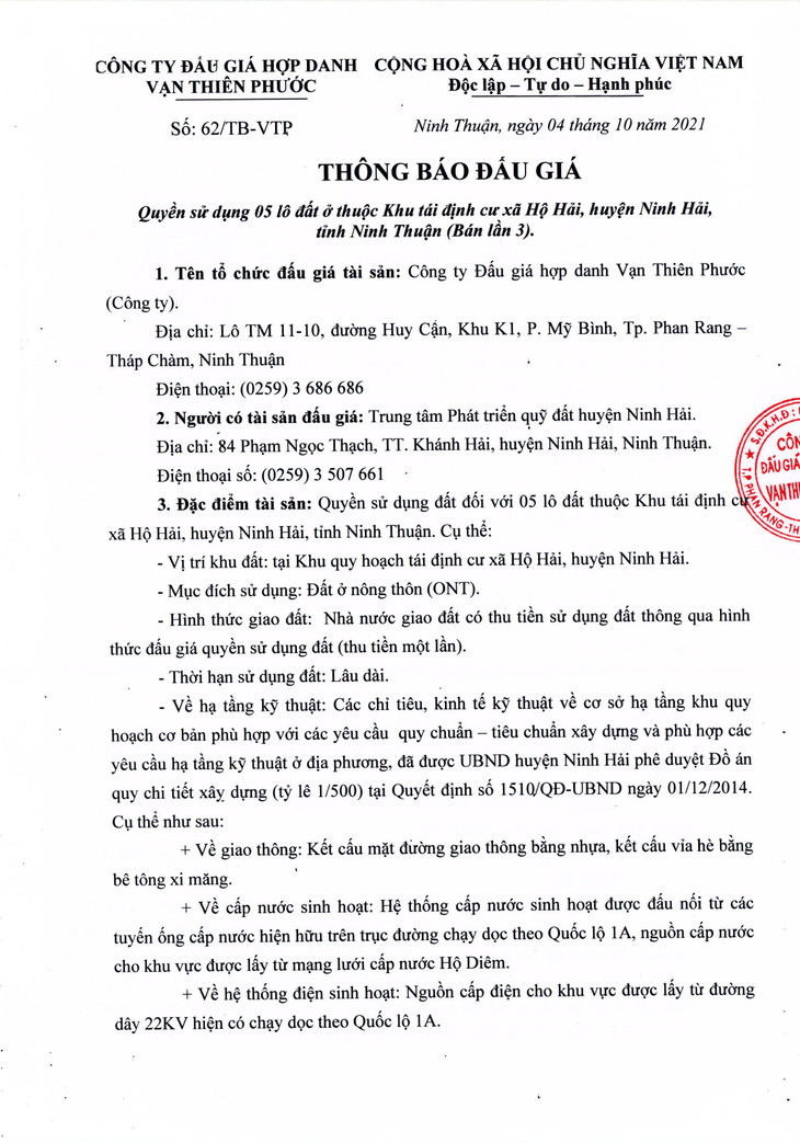 Quyền sử dụng đất đối với 05 lô đất tại Khu tái định cư xã Hộ Hải, huyện Ninh Hải, tỉnh Ninh Thuận