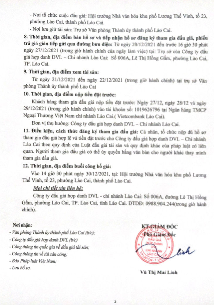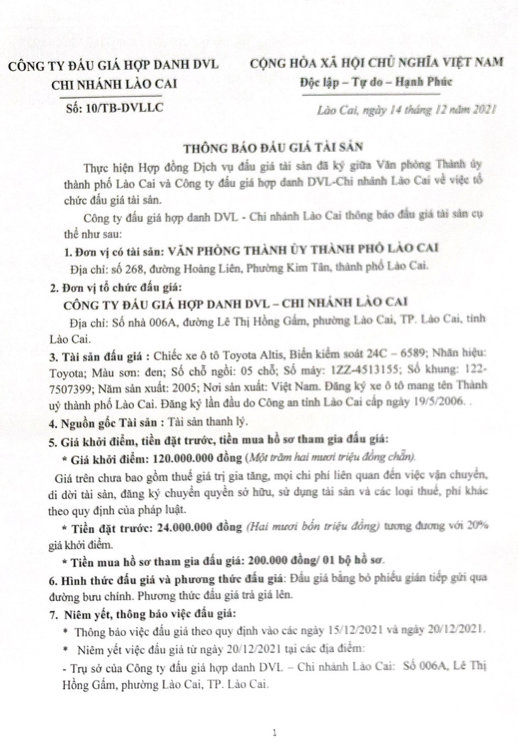 Đấu giá xe ô tô Toyota Altis, biển kiểm soát 24C – 6589; nhãn hiệu: Toyota; năm sản xuất: 2005; nơi sản xuất: Việt Nam. Đăng ký xe ô tô mang tên Thành uỷ thành phố Lào Cai. Đăng ký lần đầu do Công an tỉnh Lào Cai cấp ngày 19/5/2006.