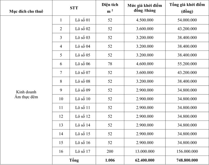 Đối với cho thuê kinh doanh ẩm thực đêm: Căn cứ theo diện tích, vị trí tiếp xúc lối vào của các lô kinh doanh ẩm thực. Thời gian kinh doanh từ 17 giờ đến 02 giờ sáng.Thời gian thuê: 12 tháng kể từ ngày bàn giao tài sản trúng đấu giá.