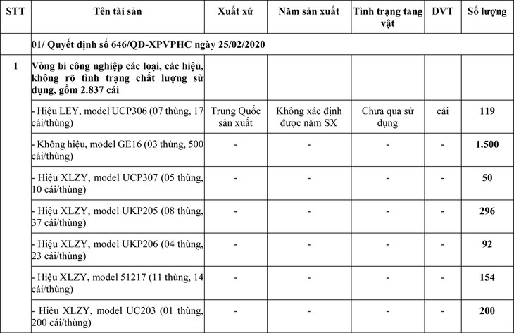 - Tài sản 2: Lô vòng bi công nghiệp, vòng bi (bạc đạn).