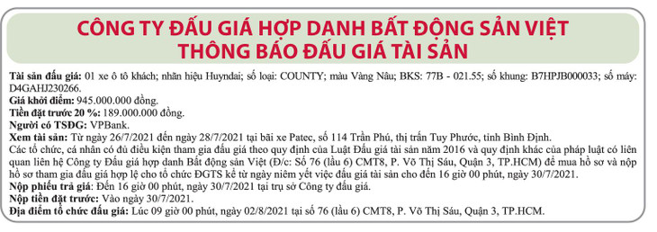 Ngày 30/7/2021, đấu giá xe ô tô Hyundai tại TP.HCM