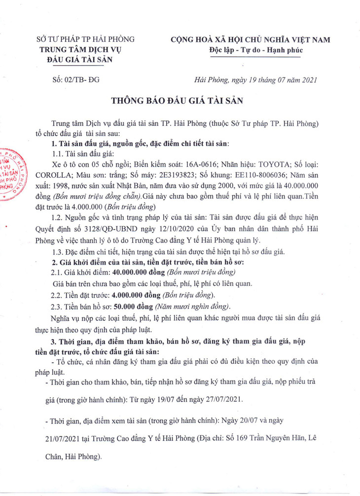 Xe ô tô con 05 chỗ ngồi; Biển kiểm soát: 16A-0616; Nhãn hiệu: TOYOTA; Số loại: COROLLA; Màu sơn: trắng; Số máy: 2E3193823; Số khung: EE110-8006036; Năm sản xuất: 1998, nước sản xuất Nhật Bản, năm đưa vào sử dụng 2000