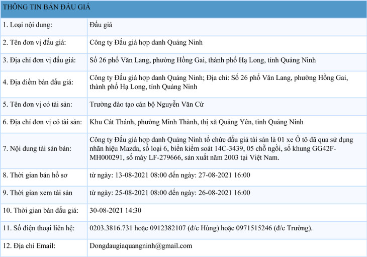 Công ty Đấu giá hợp danh Quảng Ninh tổ chức đấu giá tài sản là 01 xe Ô tô đã qua sử dụng nhãn hiệu Mazda, số loại 6, biển kiểm soát 14C-3439, 05 chỗ ngồi, số khung GG42F-MH000291, số máy LF-279666, sản xuất năm 2003 tại Việt Nam.