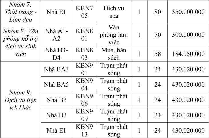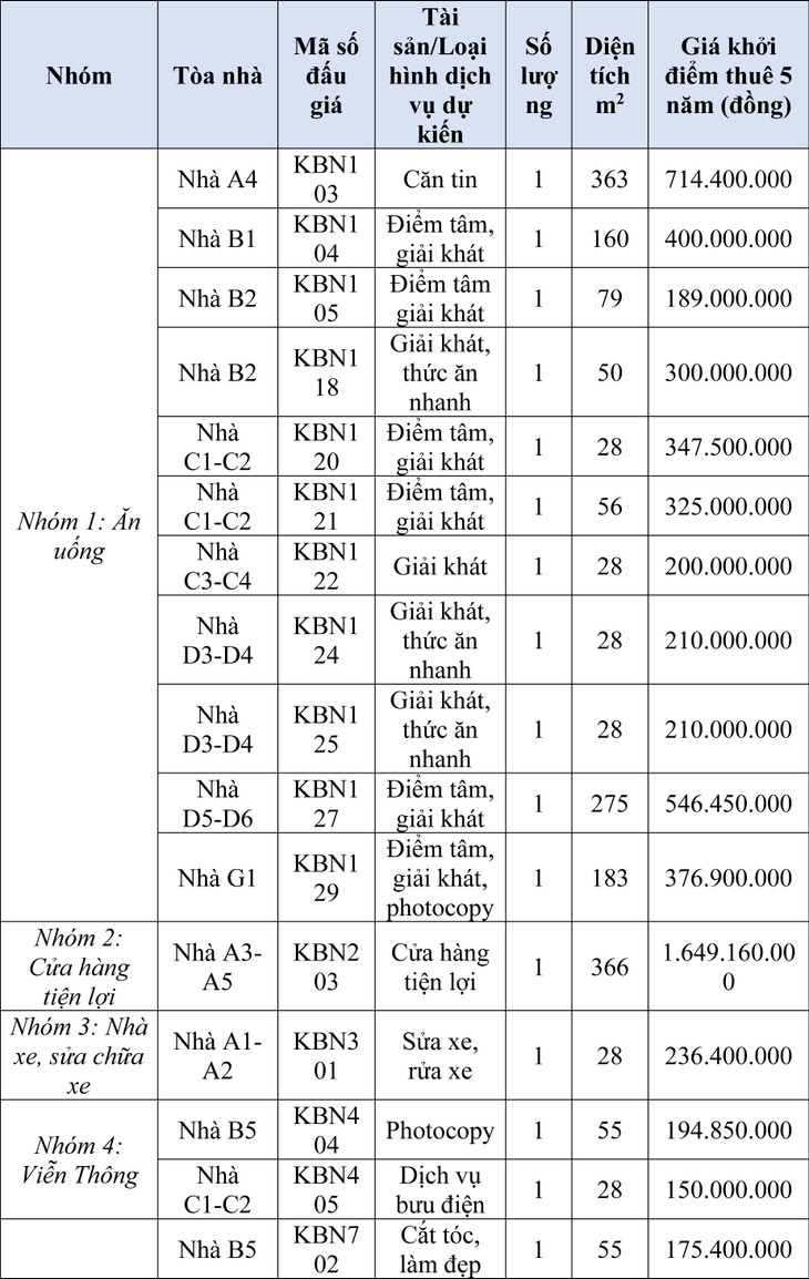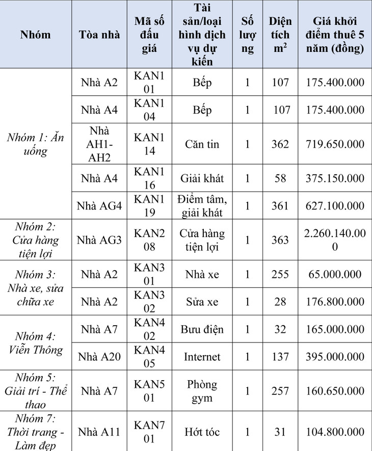 1. Quyền sử dụng các mặt bằng tại từng tòa nhà của Trung tâm Quản lý ký túc xá tại KTX khu A theo Đề án Sử dụng tài sản công vào mục đích cho thuê. Thời gian thực hiện hợp đồng thuê: 05 năm = 60 tháng.