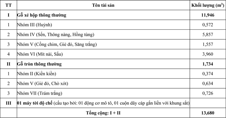 3.2. Lô 2: 13,680 m3 gỗ xẻ hộp, tròn các loại và 01 máy tời độ chế (cấu tạo bởi: 01 động cơ mô tô, 01 cuộn dây cáp gắn liền với khung sắt). Đặc điểm của tài sản