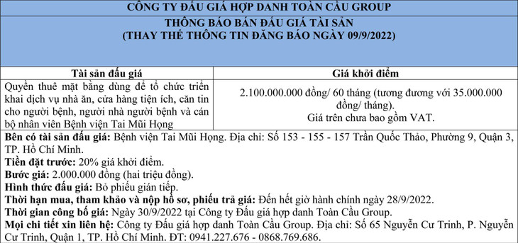 Tài sản đấu giá: Quyền thuê mặt bằng dùng để tổ chức triển khai dịch vụ nhà ăn, cửa hàng tiện ích, căn tin cho người bệnh, người nhà người bệnh và cán bộ nhân viên Bệnh viện Tai Mũi Họng. Thời hạn ký hợp đồng thuê tài sản đấu giá là 02 (hai) năm.
